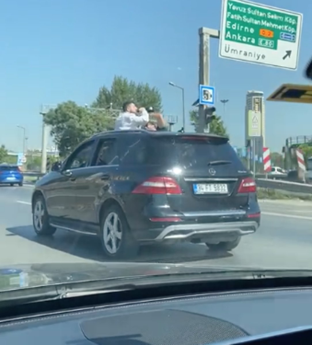 Ensonhaber Whatsapp hattına gelen ihbara göre, E-5 Otoyolu üzerinde ilerleyen lüks aracın üst camına 2 genç çıktı.