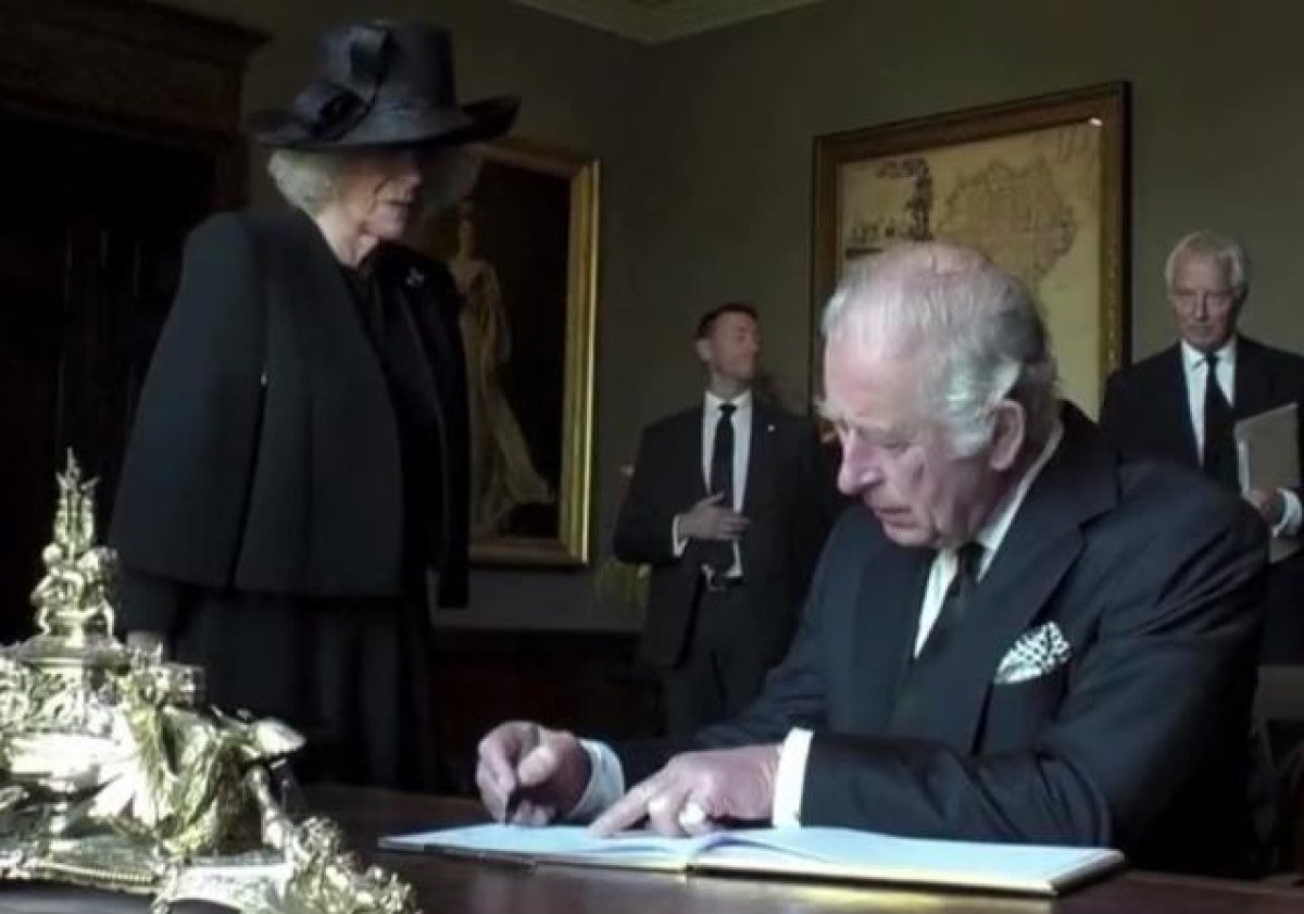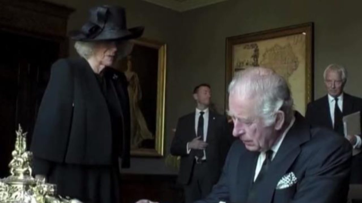 Videoda Kral 3. Charles’ın, eline mürekkep bulaşmasının ardından odayı terk ettiği ve deftere imzayı eşi Camilla’nın attığı görüldü.