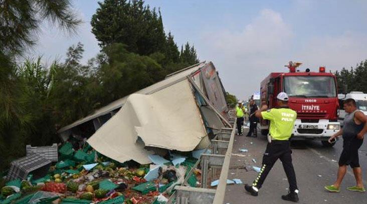 Kaza, saat 08.30 sıralarında Serik- Manavgat D-400 kara yolu Çakış Kavşağı mevkisinde meydana geldi. Serik’ten Manavgat yönüne giden Muharrem Aydın idaresindeki 07 YAV 44 plakalı kamyon ile aynı istikametteki İsmail Erdem’in kullandığı 07 EYS 07 plakalı tur otobüsü çarpıştı. Savrulan karpuz yüklü kamyon yolun sağındaki bariyerlere çarparak şarampole yuvarlanırken, tur otobüsü ise 300 metre ilerde durabildi. Kazada, araçta sıkışan kamyonun şoförü Muharrem Aydın, yaşamını yitirdi. Aydın’ın yanındaki oğlu Ramazan Aydın ile tur otobüsündeki yabancı uyruklu 5 kişi ve sürücü Erdem, yaralandı.